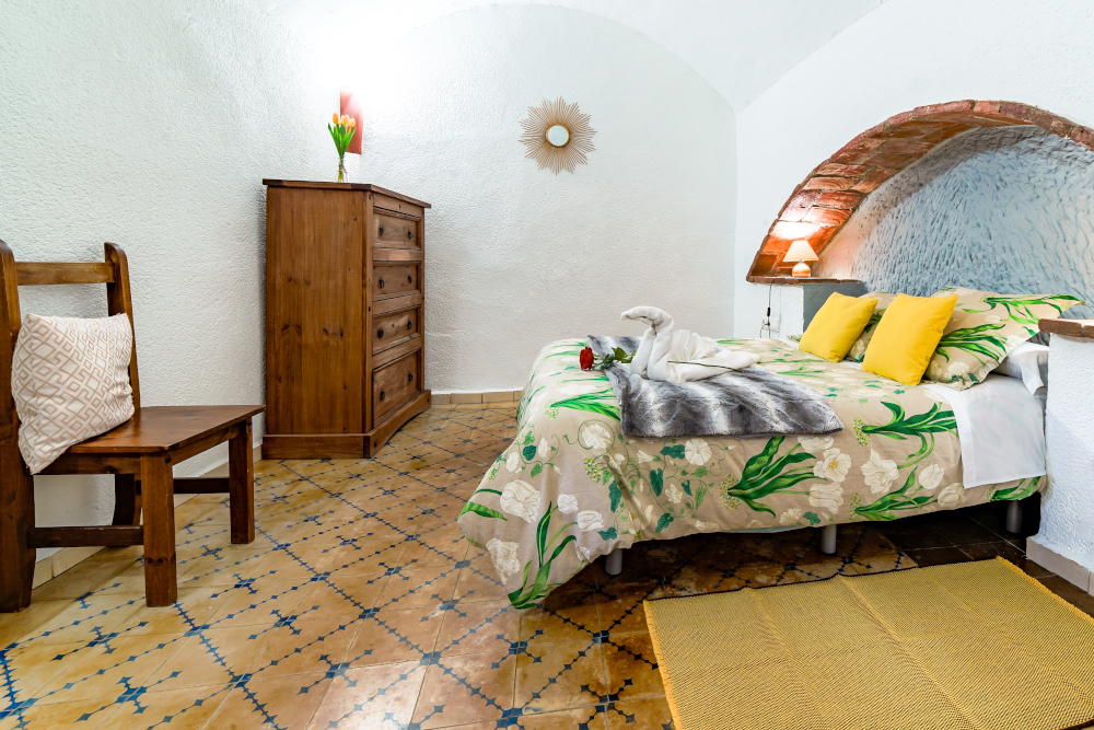 La cueva El Arao de 1 dormitorio, se encuentra ubicada frente al jardín principal. Tiene una terraza con una mesa y 2 sillas de jardín. Dispone de cocina completa con microondas, frigorífico, batidora, tostadora, exprimidor, menaje completo para cocinar y servir. El salón-comedor dispone de sofá, televisión, mesa de comedor y sillas. Tiene un dormitorio con cama de matrimonio, ropa de cama, armario, cómoda y mantas. Dispone de baño completo, con juego de toallas, secador de pelo, gel, champú y jabón de manos.