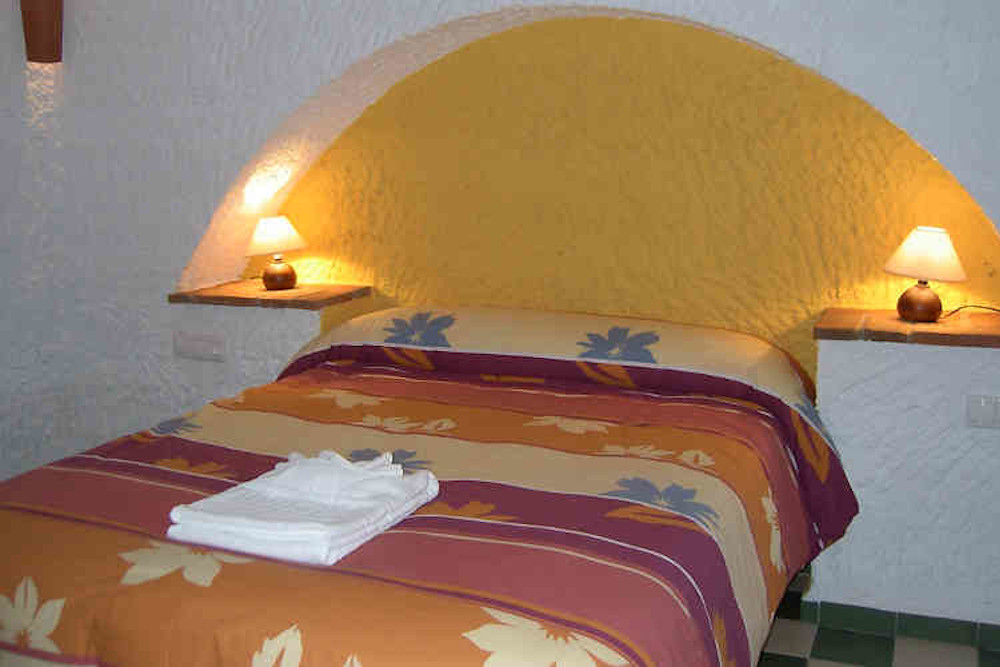 La cueva El Pozo de 2 dormitorios, se encuentra ubicada frente al jardín principal. Tiene una terraza con una mesa y 2 sillas de jardín. Dispone de cocina completa con microondas, frigorífico, batidora, tostadora, exprimidor, menaje completo para cocinar y servir. El salón-comedor dispone de sofá, televisión, mesa de comedor y sillas. Tiene un dormitorio con cama de matrimonio y otro con 2 camas individuales, ropa de cama, armario, cómoda y mantas. Dispone de baño completo, con juego de toallas, secador de pelo, gel, champú y jabón de manos.