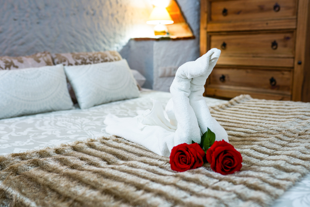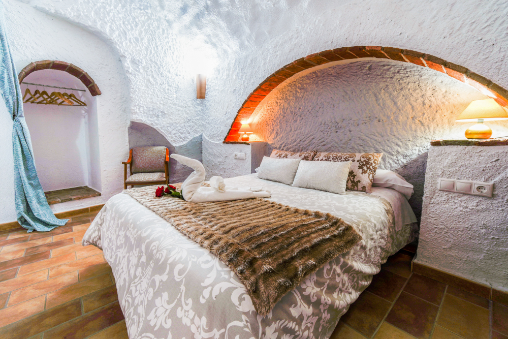 La cueva El Trillo de 2 dormitorios, se encuentra ubicada frente al jardín principal. Tiene una terraza con una mesa y 2 sillas de jardín. Dispone de cocina completa con microondas, frigorífico, batidora, tostadora, exprimidor, menaje completo para cocinar y servir. El salón-comedor dispone de sofá, televisión, mesa de comedor y sillas. Tiene un dormitorio con cama de matrimonio y otro con 2 camas individuales, ropa de cama, armario, cómoda y mantas. Dispone de baño completo, con juego de toallas, secador de pelo, gel, champú y jabón de manos.